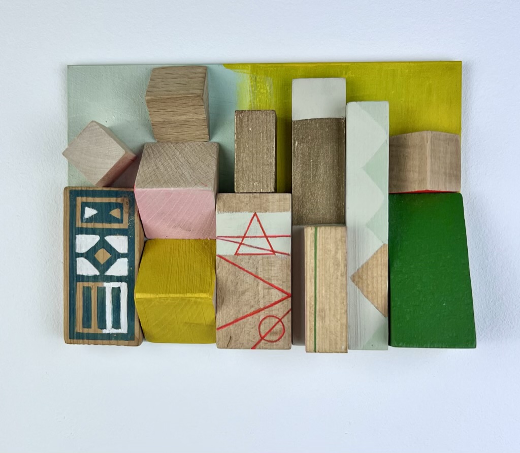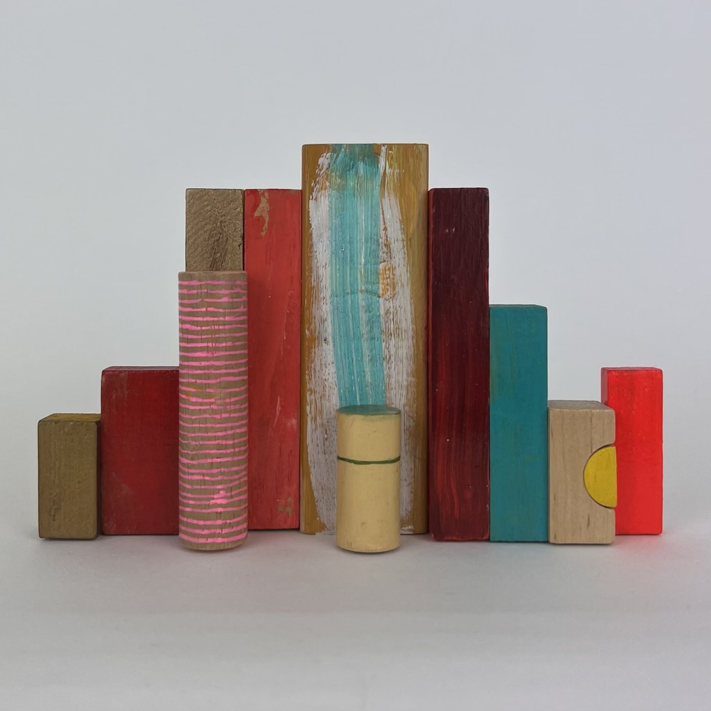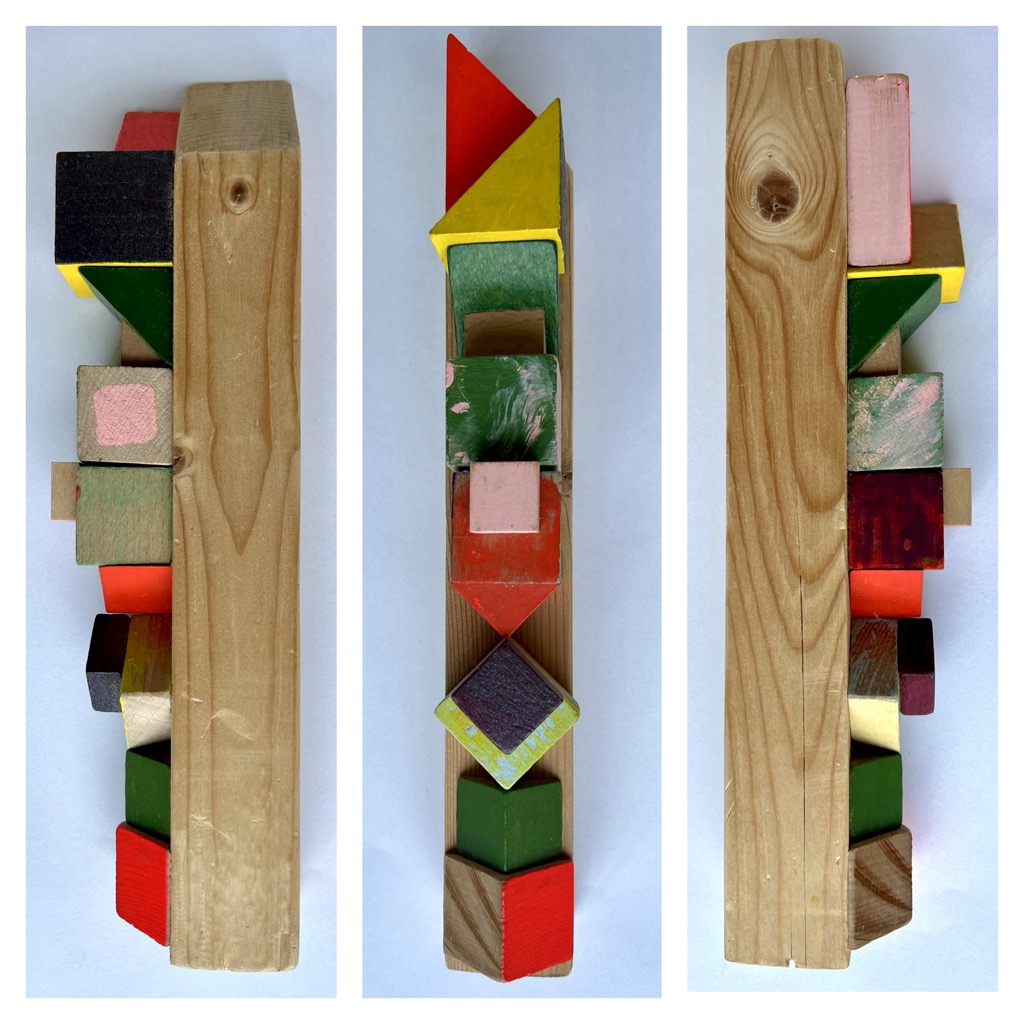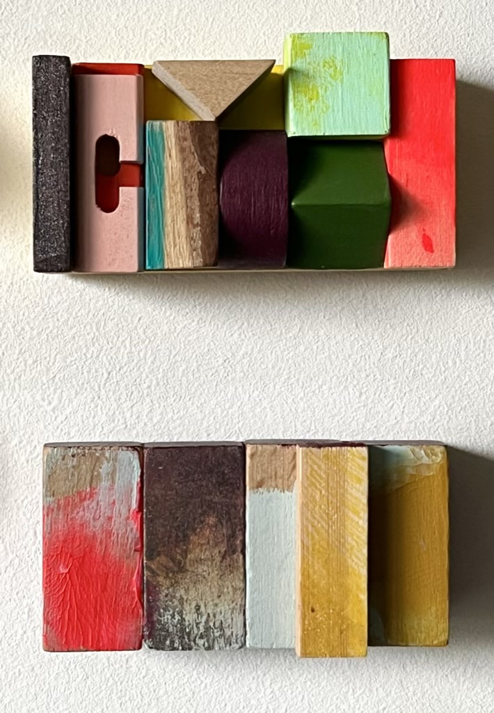 Serie van 15 werken Assemblages van voornamelijk gevonden en gekregen stukken hout/ houten (speelgoed)blokjes en heel af en toe Iets van metaal of plastic.