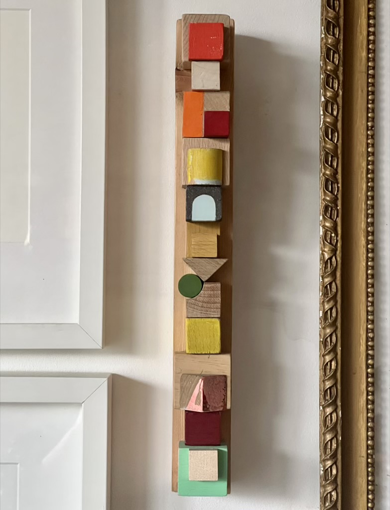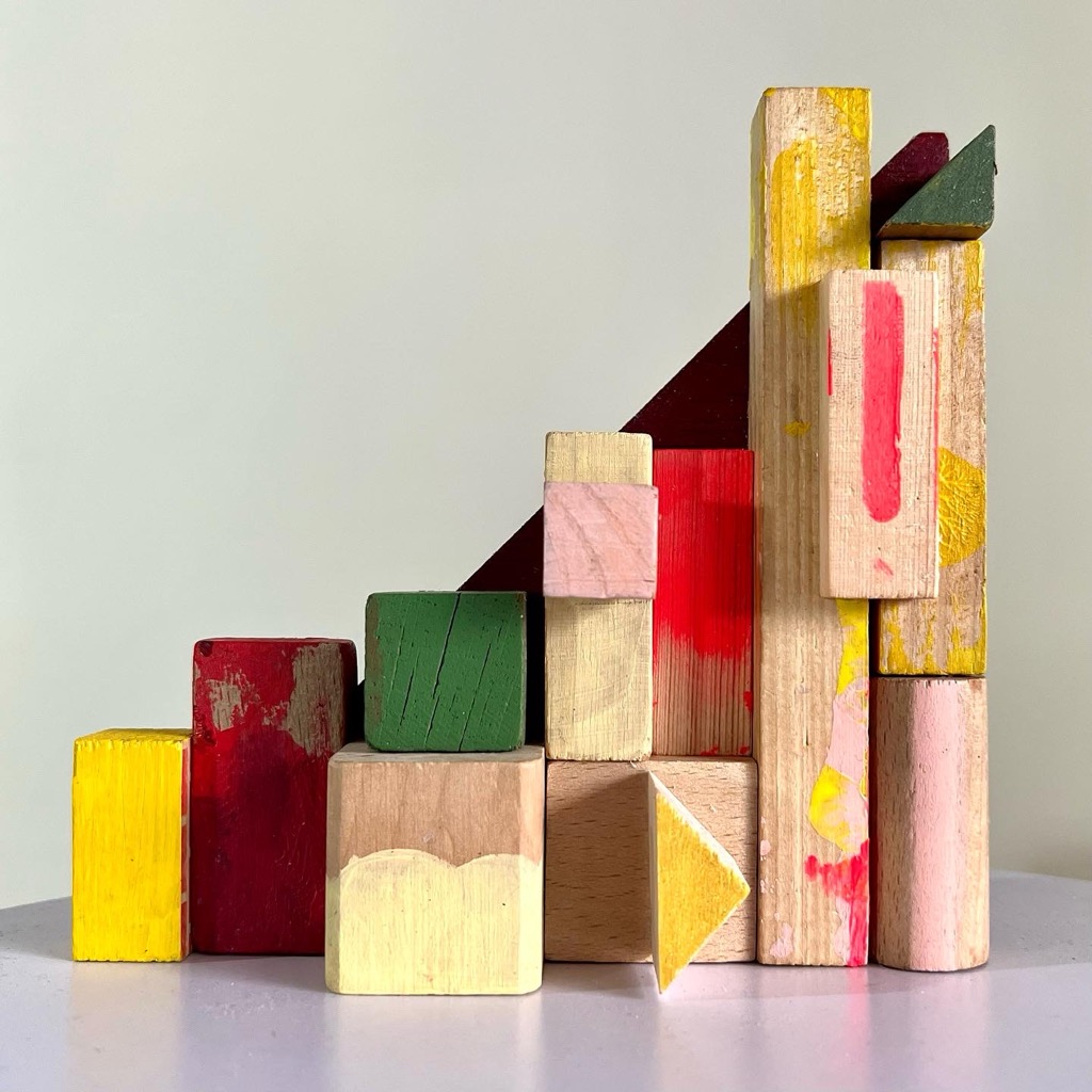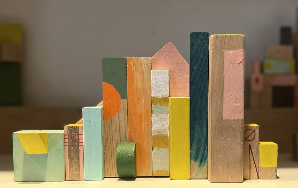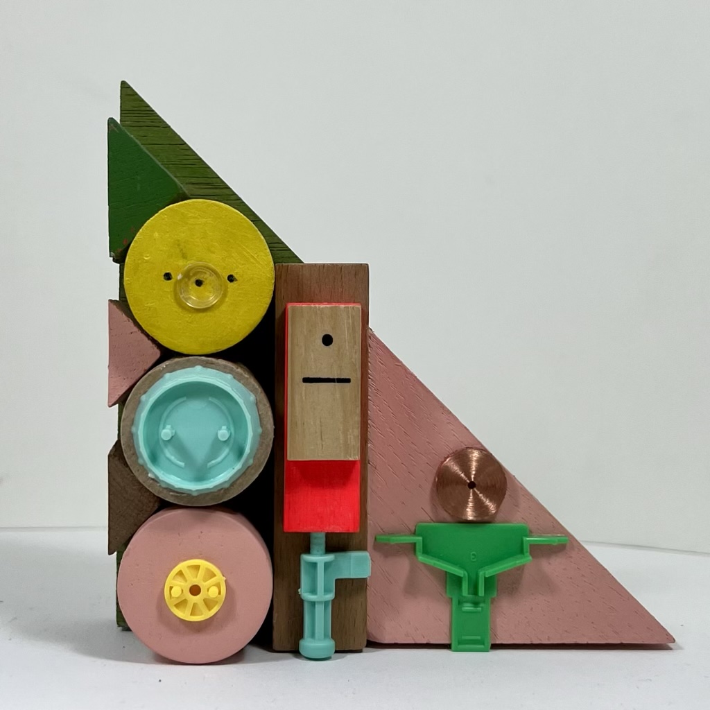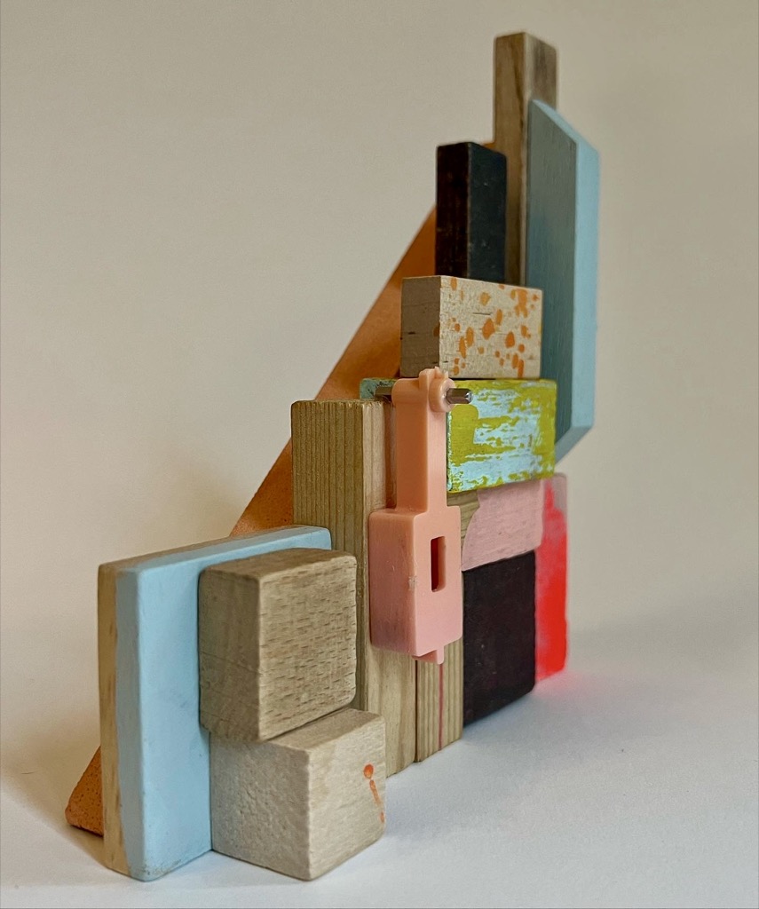 Serie van 15 werken Assemblages van voornamelijk gevonden en gekregen stukken hout/ houten (speelgoed)blokjes en heel af en toe Iets van metaal of plastic.